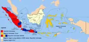 Em janeiro de 1942, os japoneses invadiram as Índias Orientais Neerlandesas, afastando o governo colonial holandês.[1] Em 17 de agosto de 1945, dois dias depois da rendição japonesa, o líder nacionalista indonésio Sukarno declarou a independência indonésia.[2] Os holandeses, vendo Sukarno e a liderança indonésia como uma colaboração aos japoneses, decidiram restaurar autoridade holandesa na região.[3] Entretanto, a britânica South East Asia Command, sob Louis Mountbatten, que era responsável pelas Índias Orientais Neerlandesas, se recusou a permitir que as tropas holandesas desembarcassem em Java e Sumatra e reconheceu de facto a autoridade republicana. Porém, os holandeses conseguiram reafirmar o controle sobre a maior parte da área anteriormente ocupada pela marinha japonesa, incluindo Bornéu e o Grande Leste. Discussões entre os britânicos e os holandeses resultaram na proposição do Governador-geral das Índias Orientais Neerlandesas Hubertus van Mook de autodeterminação para a comunidade indonésia.[4][5] Em julho de 1946, os holandeses organizaram a Conferência de Malino em Celebes na qual representantes de Bornéu e da Indonésia Oriental apoiaram a proposta de uma federação dos Estados Unidos da Indonésia ligado à Holanda. A federação abrangeria três elementos, a República da Indonésia, um estado em Bornéu e outro para a Indonésia Oriental.[6][7] A isso seguiu-se o Acordo de Linggadjati, em que a unilateralmente declarada República da Indonésia concordou com o princípio de uma Indonésia federativa.[8][9] Os holandeses então organizaram a Conferência de Denpasar em dezembro de 1946, que levou ao estabelecimento do Estado da Indonésia Oriental, seguido por um estado no oeste de Bornéu em 1947.[10]