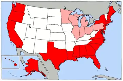 Estados que possuem litoral em oceano/golfo estão em cor vermelho escuro, já os estados que possuem litoral nos Grandes Lagos, estão representados na cor vermelho claro