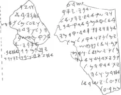 O primeiro fragmento "A" foi descoberto no mês de julho de 1993, e o segundo e terceiro fragmentos, o "B1" E "B2", que encaixavam no primeiro fragmento foram encontrados no ano seguinte. Este encaixe é meio incerto e muito discutido, mas se o ajuste estiver correto, então essas peças eram originalmente formadas lado a lado, conforme mostra a figura no final deste artigo.