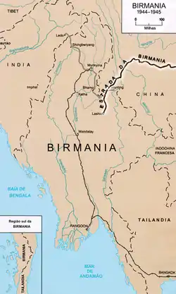 Os japoneses lançaram sua última ofensiva em 1944 para deter o suprimento aos chineses, que foi detida pelo 14º Exército, formado por tropas anglo-indianas, na Batalha de Imphal-Kohima. A despeito da chegada das monções, as tropas continuaram avançando até finalmente capturarem Rangum a 3 de maio de 1945.[3]