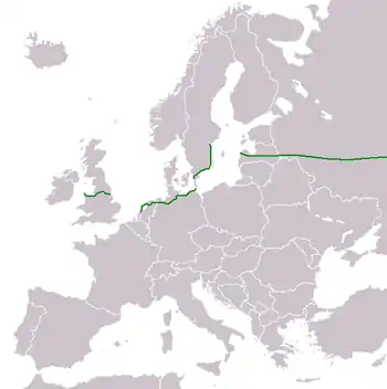 E 22 Holyhead - Chester - Warrington - Manchester - Leeds - Doncaster - Immingham … Amsterdam - Gronningen - Oldenburg - Bremen - Hamburg - Lübeck - Rostock - Stralsund - Sassnitz … Trellenborg - Malmö - Kalmar - Norköping … Ventspils - Riga - Rezekne - Velikie Luki - Moskva - Vladimir - Nizhny Novgorod - Kazan - Elabuga - Perm - Ekaterinburg - Tyumen – Ishim