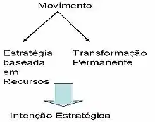 Na evolução do pensamento sobre estratégia organizacional podemos distinguir dois momentos: o momento do posicionamento e o momento do movimento. No primeiro momento a estratégia organizacional pressupõe uma adaptação ao meio envolvente para deste modo adquirir uma posição dominante e proceder seguidamente à sua defesa. Este momento inicia-se com a análise das oportunidades, ameaças, pontos fortes e fraquezas (análise SWOT). O segundo momento da estratégia organizacional assume-se como uma ruptura, colocando em evidência uma estratégia centrada na intenção e no movimento. Neste segundo momento, a estratégia visa essencialmente à transformação permanente do jogo concorrencial e da própria empresa.entre outras situações que não serão irrelevantes apontar pois não houve estudo o suficiente para esta pesquisa