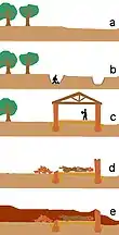 - c — Ações humanas de acúmulo de material: as paredes com suas fundações são construídas nas fundações, as valas são preenchidas ao nível do solo e o terreno nivelado; são construídos o pavimento e o telhado (unidades estratigráficas positivas)
