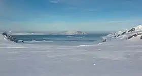 O estreito McFarlane visto da geleira Huron, a ilha Falkland com a ilha Meia-Lua e a Ilha Greenwich ao fundo.