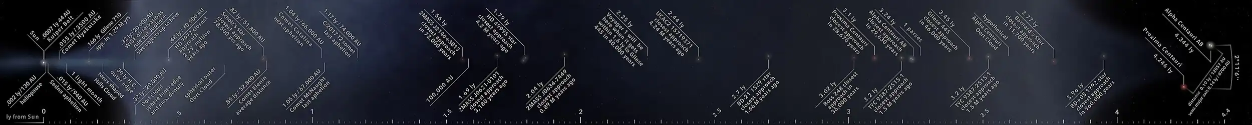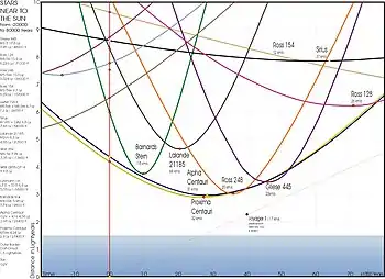 Com base nos resultados do segundo lançamento de dados da sonda espacial Gaia de abril de 2018, estima-se que 694 estrelas se aproximarão do Sistema Solar em menos de 5 parsecs nos próximos 15 milhões de anos. Destes, 26 têm uma boa probabilidade de chegar a 1.0 parsec (3.3 anos-luz) e outros 7 a 0.5 parsecs (1.6 anos-luz).[3] Este número é provavelmente muito maior, devido ao grande número de estrelas necessárias para serem pesquisadas; uma estrela se aproximando do Sistema Solar há 10 milhões de anos, movendo-se a uma velocidade típica do Sol de 20 a 200 quilômetros por segundo, estaria de 600 a 6.000 anos-luz do Sol atualmente, com milhões de estrelas mais próximas do Sol. O encontro mais próximo do Sol previsto até agora é a estrela anã laranja de baixa massa Gliese 710/HIP 89825 com aproximadamente 60% da massa do Sol.[4] Atualmente, está previsto que passe 19.300 ± 3.200 unidades astronômicas (0.305 ± 0.051 anos-luz) do Sol em 1.280+0.041