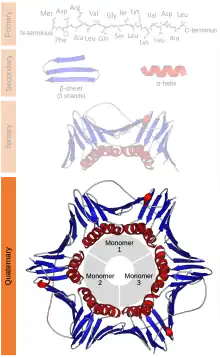 A estrutura quaternária da proteína é o quarto e mais alto nível de classificação da estrutura da proteína. A estrutura quaternária refere-se à estrutura das proteínas que são compostas por duas ou mais cadeias de proteínas menores (também referidas como subunidades). A estrutura quaternária da proteína descreve o número e o arranjo de várias subunidades de proteínas dobradas em um complexo de várias subunidades. Inclui organizações de dímeros simples a grandes homooligômeros e complexos com números definidos ou variáveis de subunidades.[1] Em contraste com os três primeiros níveis da estrutura proteica, nem todas as proteínas terão uma estrutura quaternária, pois algumas proteínas funcionam como unidades únicas. A estrutura quaternária também pode se referir a complexos biomoleculares de proteínas com ácidos nucléicos e outros cofatores.