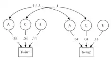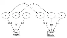 , portanto, é duas vezes a diferença entre correlações de gêmeos idênticos e fraternos: o efeito genético aditivo (fórmula de Falconer). é simplesmente a correlação MZ menos essa estimativa de . O fator aleatório (único) é de , ou seja, os gêmeos MZ diferem devido apenas a ambientes únicos. (Jinks & Fulker, 1970; Plomin, DeFries, McClearn e McGuffin, 2001).
