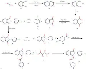 O composto (5) reage com 2-amino-5-cloropiridina (6) em acetonitrila resultando na amida (7). A amida (7) é tratada com refluxo de cloreto de tionila produzindo uma imida (8) que é mono-reduzida com KBH4 formando o álcool (9). A acilação do álcool (9) com o composto (10) usando hidreto de sódio, produzindo a mistura racêmica de zopiclona (11).