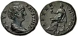 A Eternidade (a direita) em um Sestércio de Faustina Maior, circa 146-161 a.C.. Na moeda há a inscrição AETERNITAS, S C (Senatus Consulta) e, em exergo, a Eternidade drapeada, sentada no trono, virada à esquerda e segurando a fênix (nimbate) no globo na mão direita e um cetro na esquerda.