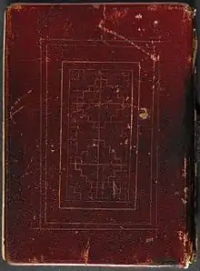 A decoração da capa é dividida em campos delimitados por linhas elevadas. O campo central contém uma decoração vegetal que representa um cálice estilizado no centro, com um broto e hastes de videira rolando, frutas e várias folhas pequenas.[35] Acima e abaixo do design central, existem campos contendo ornamentos entrelaçados em linhas finamente entalhadas. Os três detalhes são colocados dentro de uma borda que contém mais entrelaçamento.