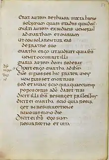 O texto é uma cópia muito boa e cuidadosa do Evangelho de João, do que foi chamado a família de textos "Ítalo-Northumbrianos"; outros exemplos bem conhecidos são os vários manuscritos de Wearmouth-Jarrow, incluindo o Codex Amiatinus, os Evangelhos de Lindisfarne e o Evangeliário MS Royal 1. B. VII. Presume-se que essa família tenha derivado de um hipotético "Evangeliário Napolitano" trazido para a Inglaterra por Adrian de Canterbury, um companheiro de Teodoro de Tarso, que Beda diz ter sido um abade de Nisida, um mosteiro igualmente hipotético perto de Nápoles. Nas rubricas dos Evangelhos de Lindisfarne, há várias que são "especificamente napolitanas", incluindo festivais que foram celebrados apenas em Nápoles, como A Natividade de São Januário e a Dedicação da Basílica de Estevão. O manuscrito napolitano provavelmente estava na Abadia de Wearmouth-Jarrow.[12]