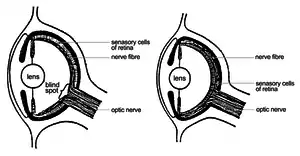As diferenças entre as retinas invertidas e não invertidas, e as células censoras abaixo do axônio podem ser vistos na figura (em inglês). Isso resulta na ausência de células censoras onde o nervo óptico liga-se ao olho, consequentemente criando um ponto cego. O olho do polvo tem uma retina não invertida logo, as células sensoras ficam sobre o axônio. Portanto não há ponto cego nesse tipo de olho. Fora essa diferença, os dois olhos são incrivelmente similares, um exemplo de evolução convergente.