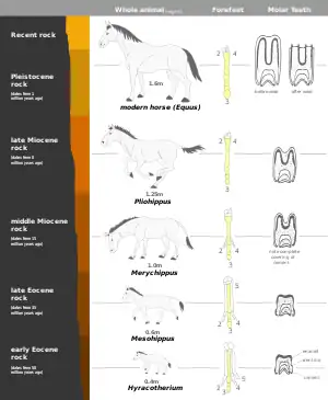 Devido à descoberta de um registro fóssil praticamente completo encontrado nos depósitos sedimentares da América do Norte do período antigo do Eoceno até o presente, o cavalo apresenta um dos melhores exemplos de história evolucionária (filogenia).