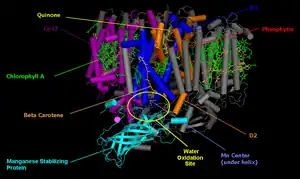 As evidências sugerem que o manganês (Mn) foi incorporado pela primeira vez aos sistemas biológicos há cerca de 3,2 – 2,8 bilhões de anos, durante o Período Arqueano. Junto com o cálcio, formou o complexo manganês-óxido de cálcio (determinado por cristalografia de raios-X) que consistia em um aglomerado de manganês – essencialmente uma estrutura inorgânica cubana (cúbica). A incorporação de um centro de manganês no fotossistema II foi altamente significativa, pois permitiu a evolução do oxigênio fotossintético das plantas. O complexo evolutivo de oxigênio (OEC) é um componente crítico do fotossistema II contido nas membranas tilacóides dos cloroplastos; é responsável pela foto-oxidação terminal da água durante as reações à luz.[12]