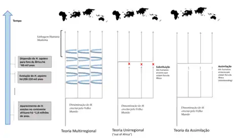 É consenso entre estas três teorias que um dos primeiros representantes do gênero Homo, o Homo erectus, evoluiu a partir de outra espécie no leste da África há pelo menos 1,8 milhões de anos e migrou pioneiramente para diferentes regiões do velho mundo, como para outras regiões africanas, o oriente médio e o leste e sul asiático.[2] Ele deu origem a múltiplas espécies humanas, incluindo o Homo neanderthalensis (Neandertais), os Denisovanos e os Homo sapiens (H. sapiens).[3] Numerosos esforços se uniram na tentativa de descrever precisamente a maneira, o local e o período em que ocorreu o processo evolutivo gerador do H. sapiens, suscitando intensos conflitos no meio científico durante as décadas passadas.[1] O modelo do multirregionalismo teoriza que as populações humanas arcaicas de H. erectus, presentes em múltiplos centros regionais da África e da Eurásia após a migração há cerca de 1,8 milhões de anos, mantiveram ocasionalmente laços sociais e biológicos, evoluindo conjuntamente para formar o H. sapiens.[1][4][5] Neste modelo, embora as populações em diversas localidades viveriam parcialmente isoladas, o que serviria para gerar a diversidade comportamental e biológica entre elas, eventos migratórios acabariam levando essas diferentes populações a entrarem em contato. Isso permitiria a troca de ideias (transmissão cultural) e de genes (intercruzamentos) entre elas. Devido à manutenção do intercruzamento, estas populações compartimentalizadas teriam dificuldade de se separar em diferentes espécies, mantendo-se efetivamente como uma única espécie (na definição de espécie de Ernst Mayer) e evoluindo em um contínuo ao longo do tempo (continuidade).[1][4] Essa concepção possui um impacto profundo na compreensão da origem do H. sapiens, já que o H. erectus seria o seu ancestral mais recente (ancestral direto), além de que todas as outras espécies de hominíneos intermediárias entre H. erectus e H. sapiens descritas até hoje seriam consideradas a mesma espécie com variações regionais.[6]