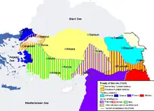 O Tratado de Sèvres (10 de agosto de 1920) foi um tratado de paz entre o Império Otomano e os Aliados no final da Primeira Guerra Mundial. O Tratado de Versalhes assinado com a Alemanha antes deste tratado para anular as concessões alemãs, incluindo os direitos económicos e empresas. Além disso, França, Grã-Bretanha e Itália assinaram em segredo um "acordo tripartido", na mesma data.[12] O Acordo Tripartite confirmou a Grã-Bretanha concessões comerciais e petrolíferas e transformou as ex-empresas alemãs no Império Otomano em uma corporação Tripartite. As negociações abertas abrangeu um período de mais de quinze meses, com início na Conferência de Paz de Paris. As negociações continuaram na Conferência de Londres, e tomou forma definitiva apenas após a reunião da estreia na Conferência de San Remo, em Abril de 1920. França, Itália e Grã-Bretanha, porém, tinham começado secretamente a partilha do Império Otomano, tão cedo quanto 1915. O atraso foi devido ao fato de que as potências não conseguiram chegar a um acordo que, por sua vez, dependia do resultado do Movimento Nacional Turco. O Tratado de Sèvres foi anulado no decurso da Guerra de Independência Turca e as partes assinaram e ratificaram o Tratado de Lausanne em 1923.