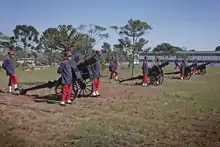 As instalações industriais no início da República eram uma Fábrica de Cartuchos e Artefatos de Guerra (Rio de Janeiro), duas Fábricas de Pólvora (Rio e Mato Grosso) e três Arsenais de Guerra (Rio, Rio Grande do Sul e Mato Grosso).[222] Não eram fábricas de armamento,[223] que continuava importado, com os arsenais brasileiros limitando-se à montagem e manutenção. Havia algumas empresas privadas no setor, como a Rossi e Fábrica Nacional de Cartuchos.[224] As instalações em Mato Grosso foram desativadas no início do século XX.[lower-alpha 9] Uma fábrica de pólvora sem fumo foi instalada em Piquete, São Paulo, em 1909. A munição de pequenos e médios calibres era produzida na Fábrica de Cartuchos, no Realengo, e no Arsenal de Guerra do Rio de Janeiro, mas ainda era preciso importar, especialmente dos Estados Unidos. Esses poucos empreendimentos fabris trabalhavam com matérias-primas importadas.[223][225]