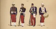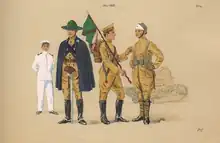 Em 1889 o Exército usava uma série de armamentos importados. A infantaria usava o fuzil Comblain, alguns fuzis Minié antigos e baionetas.[202] Essas armas seriam usadas por formações em linha ao estilo napoleônico ou da Guerra do Paraguai, com o pelotão como unidade de emprego básica e movimentos semelhantes à ordem unida da atualidade. A evolução tática ocorrida na Europa não foi acompanhada.[203] A cavalaria usava carabinas de repetição Winchester, adaptadas aos cartuchos Comblain, revólveres Nagant e sabres. Metade dos regimentos portava lanças.[202][lower-alpha 5] A artilharia de campanha usava peças La Hitte, Paixahans, Whitworth e Krupp, e a artilharia de costa, Parrot, Whitworth, Armstrong e Krupp, além de foguetes Congreve.[202] A metralhadora era a Nordenfelt desde 1889, com duas para cada batalhão de infantaria e duas a quatro para cada regimento de cavalaria ou artilharia de campanha.[204] A cor predominante dos uniformes era o azul-escuro.[202]