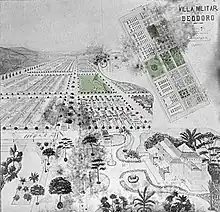 No Rio de Janeiro as instalações militares, algumas usadas pelo Exército desde o século XVIII, concentravam-se no centro e litoral durante o Império, mas desde 1850 havia uma interiorização dos quartéis, motivada pela valorização imobiliária, a necessidade de espaços abertos para treinar novas manobras e armamentos e a defesa das reservas de material bélico. Os novos quartéis acompanharam as ferrovias.[230] O primeiro esforço significativo para aliviar a deficiência de instalações foi a Vila Militar, cuja construção começou em 1909.[228] Ela era posicionada ao longo da Estrada de Ferro Central do Brasil e vizinha ao campo de Gericinó, onde era possível realizar manobras.[231] Ela fazia parte de um complexo de áreas militares abrangendo também Deodoro, Realengo e Campo dos Afonsos, região ainda pouco urbanizada.[232]