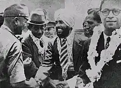 O major Fujiwara Iwaichi, da F Kikan (serviço de inteligência do Japão), cumprimenta o Capitão Mohan Singh,[1] do Primeiro Exército Nacional Indiano (abril de 1942).