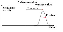 De acordo com a ISO 5725-1,[1] o termo geral "exatidão" é usado para descrever a proximidade de uma medição com o valor real. Quando o termo é aplicado a conjuntos de medições do mesmo medidor, ele envolve um componente de erro aleatório e um componente de erro sistemático. Nesse caso, a veracidade é a proximidade da média de um conjunto de resultados de medição com o valor real (verdadeiro) e a precisão é a proximidade da concordância entre um conjunto de resultados.