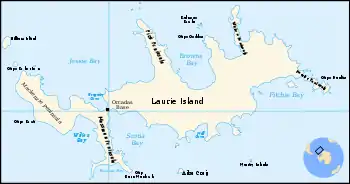 Demoraram cerca de um mês a chegar às ilhas. Depois de várias tentativas mal-sucedidas para encontrar um local para ancorar, e com o leme seriamente danificado pelo gelo, o navio, finalmente, encontrou uma baía de abrigo na costa sul da ilha Laurie, a ilha situada mais a leste da cadeias das Órcades do Sul. A 25 de Março, o navio ancorou em segurança,[23] ficando a cerca de 400 m costa. Rapidamente transformaram o navio num abrigo de Inverno, com os motores desmontados, as caldeiras vazias e uma lona a cobrir o convés.[24] Seguidamente, Bruce definiu um programa de trabalho que incluía observações meteorológicas, recolha de amostras marinhas e botânicas e a recolha de espécimenes geológicos e biológicos.[25] O principal trabalho efectuado neste período foi a construção de um edifício em pedra a que deram o nome de "Omond House", homenageando Robert Omond, director do Real Observatório de Edimburgo e apoiante da expedição.[26] O fim deste edifício era servir de alojamento ao grupo que ficariam na Ilha Laurie para trabalhar no laboratório meteorológico. O edifício foi construído com materiais locais utilizando alvenaria seca com um telhado improvisado feito de camadas de lona. A estrutura tinha 6 m de comprimento por 6 m de largura, com duas janelas, e podia abrigar seis pessoas. Rudmose Brown escreveu: "Considerando que não temos argamassa e ferramentas de construção, é uma casa bonita e duradoura. Acho que se vai manter de pé durante um século...".[27]