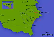 Na Sicília, a frota foi redividida em duas partes. O primeiro contingente, comandado por Nícias, navegou para Segesta e obrigou os segestanos a pagar os trinta talentos que tinham prometido aos atenienses pela sua assistência contra o seu rival Selinunte.[30] O segundo contingente, comandado por Lâmaco, navegou e invadiu Hícara, uma pequena cidade aliada de Selinunte, e escravizou sua população.[31] O exército ateniense marchou então pelo interior da Sicília, para impressionar e negociar com os sículos, e regressou a Catânia.[31] Lá eles passaram o inverno e fizeram os preparativos para o próximo cerco a Siracusa. Quando campanha militar começou, os siracusanos avançaram contra os atenienses enquanto estes ainda estavam acampados em Catânia. Enquanto os siracusanos marchavam para Catânia, souberam que os atenienses haviam embarcado em seus navios e navegado para o Grande Porto de Siracusa. Os siracusanos rapidamente voltaram e se prepararam para a batalha.[32]