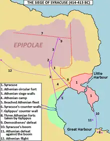 A expedição foi prejudicada desde o início pela incerteza em seu propósito e estrutura de comando - as manobras políticas em Atenas transformaram uma força leve de vinte navios em uma armada enorme, e o principal proponente da expedição, Alcibíades, foi chamado de volta do comando para ser julgado antes da frota sequer ter chego à Sicília. Ainda assim, os atenienses alcançaram sucessos iniciais. Siracusa, a cidade-estado mais poderosa da Sicília, respondeu excepcionalmente lentamente à ameaça ateniense e, como resultado, foi quase completamente cercada antes da chegada do reforço do general espartano Gilipo, que incentivou os seus habitantes a agir. Desse ponto em diante, porém, à medida que os atenienses cediam a iniciativa aos seus oponentes recém-energizados, a maré do conflito mudou. Uma enorme armada de reforço deu brevemente aos atenienses a vantagem mais uma vez, mas um desastroso ataque fracassado a um ponto estratégico e várias derrotas navais paralisantes prejudicaram a capacidade dos soldados atenienses de continuar lutando e manter o moral. Os atenienses tentaram uma evacuação de última hora de Siracusa. A evacuação falhou e quase toda a expedição foi capturada ou destruída na Sicília.