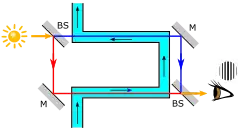 Uma representação altamente simplificada do experimento de Fizeau de 1851 é apresentada na Fig. 2. A luz que entra é dividida em dois feixes por um divisor de feixe (BS) e passa por duas colunas de água fluindo em direções opostas. Os dois feixes são então recombinados para formar um padrão de interferência que pode ser interpretado por um observador.