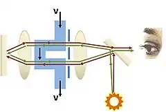 Um raio de luz que emana da fonte S' é refletida por um divisor de feixe L e é colimada num feixe paralelo pela lente L. Depois de passar pelas fendas O1 e O2, dois raios de luz viajam pelos tubos A1 e A2, através dos quais a água flui para a frente e para trás, conforme mostrado pelas setas. Os raios refletem em um espelho m no foco da lente L′, de modo que um raio sempre se propaga na mesma direção que o fluxo de água e o outro raio oposto à direção do fluxo de água. Depois de passar para a frente e para trás pelos tubos, os dois raios se unem em S, onde produzem franjas de interferência que podem ser visualizadas pela ocular ilustrada. O padrão de interferência pode ser analisado para determinar a velocidade da luz viajando ao longo de cada perna do tubo.[4][5]