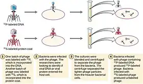 Numa primeira experiência, marcaram o ADN dos fagos com o isótopo radioactivo fósforo-32 (P-32). Deixaram que os fagos da cultura bacteriana infectassem as bactérias Escherichia coli e posteriormente retiraram as coberturas proteicas das células infectadas mediante centrifugação. Descobriram que o indicador radioactivo era visível somente nas células bacterianas e não nas coberturas proteicas.