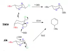 Além da estabilidade molecular, a análise conformacional é usada para prever produtos de reação. Um exemplo do uso de análise conformacional é a reação de eliminação bimolecular (E2). Essa reação ocorre mais rapidamente quando o nucleófilo ataca a espécie que é antiperiplanar ao grupo de saída. Uma análise orbital molecular desse fenômeno sugere que essa conformação fornece a melhor sobreposição entre os elétrons no orbital de ligação R-H σ que está sofrendo ataque nucleofílico e o orbital vazio σ* da ligação R-X que está sendo quebrada.[5] Ao explorar esse efeito, a análise conformacional pode ser usada para projetar moléculas mais reativas.