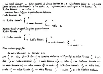 com an = √2 + an − 1, com condição inicial a1 = √2.[9] Viète fez seu trabalho muito antes de os conceitos de limites e provas rigorosas de convergência serem desenvolvidos em matemática; a primeira prova de que esse limite existe não foi dada até o trabalho de Ferdinand Rudio em 1891.[1][10]