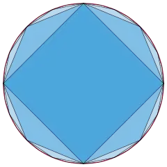 Viète obteve sua fórmula comparando as áreas de polígonos regulars com 2n e 2n + 1 lados inscritos em um círculo.[1][6] O primeiro termo do produto, √22, é a relação das das áreas de um quadrado e um octógono, o segundo termo é a relação das áreas de um octógono e um hexadecágono, etc. Assim, o produto telescopica para fornecer a razão entre as áreas de um quadrado (o polígono inicial na sequência) e um círculo (o caso limite de um 2n-gono). Alternativamente, os termos em um produto podem ser interpretados como a relação de perímetros da mesma sequência de polígonos, iniciando com a relação de perímetros de um dígono (o diâmetro de um círculo, contado duas vezes) e um quadrado, a relação de perímetros de um quadrado e um octógono, etc.[20]