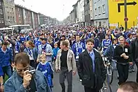 Torcedores do S04 nas ruas de Gelsenkirchen em dia de jogo.