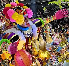 ![]() Parte frontal da alegoria com grandes padês cenográficos. As coroas de Exu e Oxalá adornam os pálios de um cortejo de Exus montados em bodes. A segunda alegoria celebra Exu enquanto Senhor do Mercado (Olojá), Senhor das Oferendas (Elebó), Senhor da faca (Olobé) e Vigia dos Odus (Odusô). Exu é a entidade que rege as trocas e dinamiza a vida social dos terreiros. Segundo Luiz Antonio Simas, "as ruas são de Exu em dias de festa e feira." Para a preparação das oferendas, faz-se necessário o trânsito por feiras e mercados. Para Simas e Luiz Rufino, "o cruzamento das noções de terreiro com a de mercado, a partir dos efeitos de determinados saberes praticados na diáspora africana, alarga tanto a noção de terreiro como a de mercado." Estabelecida a conexão entre terreiros e mercados, ergue-se um carro alegórico que funde elementos de uma Casa de Santo com a profusão de formas e cores de um mercado popular. Na parte dianteira da alegoria, vê-se enormes padês cenográficos arriados em homenagem às divindades que regem as trocas. Nas coroas de Exu e Oxalá, o equilíbrio de opostos complementares, elementos decorativos que adornam os pálios de um cortejo de Exus montados em bodes. Ogãs, zeladores e filhos de Santo do Ilê Axé Monadeuy bailam em um espaço cenográfico remetendo à visão do interior do barracão da Casa Branca do Engenho Velho, terreiro fundado na década de 1830, em Salvador. Uma grande coroa exibe as comidas sagradas dessas divindades. ![]() Visão lateral da segunda parte do carro alegórico. ![]() Alegoria une elementos de uma Casa de Santo com a profusão de formas e cores de um mercado popular. Destaques e composições Destaques centrais baixos: Babá Adailton Moreira (Babalorixá do Ilê Omiojuarô), Flávia Oliveira (jornalista), Luiz Bangbala (ogã vivo mais antigo do Brasil, com 102 anos), Luiza Maria (Mameto Monadeuy), Maria Eni Souza (Makota Arrungindala) e vestem roupas cerimoniais (Herança do Axé) Destaque central médio: Danyllo Gayer (Fantasia: "O Ifá nas entrelinhas dos Odus") Destaque performático alto: Átila Bee (Fantasia: Senhor dos Mercados) Composições frontais bailado: Ogãs, zeladores e filhos de Santo do Ilê Axé Monadeuy (Fantasia: Roupas cerimoniais) Composições laterais: Fantasia Os segredos dos temperos Composições teatralizadas: Fantasia Mercadores e feirantes |