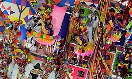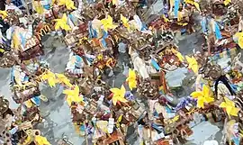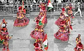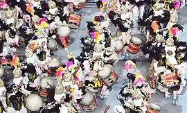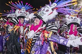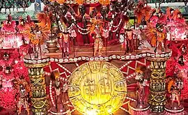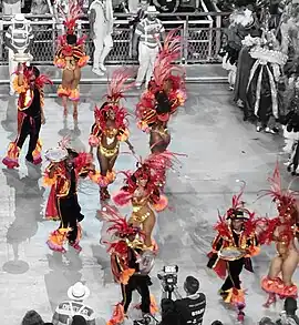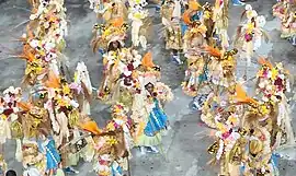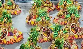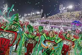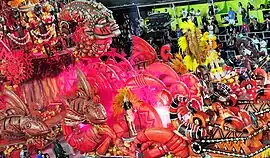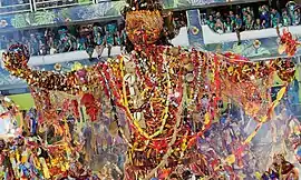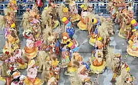 ![]() Ala 17: "Palhaços e Folia". A fantasia é inspirada nas roupas dos palhaços das Folias de Reis, populares em todo o Brasil. Os brincantes são associados, em muitas interpretações, a Exus. O pesquisador Diogo Goltara aponta que "o palhaço é constantemente relacionado à figura misteriosa de Exu. As cores, os chifres (...) são símbolos que saltam aos olhos no que concerne à semelhança entre estes seres." O autor informa, ainda, que os próprios nomes de alguns palhaços se assemelham a nomes de Exus Catiços. Na ala, componentes desfilam com chapéus/cabeças em forma de máscaras que simulam o trabalho em papier-mâché, técnica utilizada por mestres artesãos. São seis tipos de máscaras que contemplam outras festas e folias, como La Ursa, Zambiapunga, Caretas e Cavalhadas, além do Saci, personagem do folclore brasileiro que reúne as características de Exu, como o gorro vermelho e o gosto pelas travessuras. |
