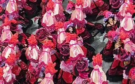 ![]() Velha guarda: "Zé Pelintra e Maria Navalha". Os homens da Velha Guarda da Grande Rio vestem o figurino característico de Zé Pelintra: Terno de linho branco, sapatos de cromo, chapéu panamá e gravata vermelha. Enquanto as mulheres representam Maria Navalha, também com roupas nas cores vermelho e branco. Segundo a tradição oral, Pelintra e Navalha moram na Lapa, no Rio de Janeiro, reduto da boemia carioca, exaltado no quarto setor do desfile. |