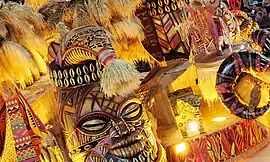 | Ala 2: "Exu Caboclo" Nas Américas, os Exus africanos se metamorfosearam, passando por processos de hibridismos e fusões culturais. No Brasil, o louvor aos orixás se uniu aos rituais indígenas, intercâmbio que reconfigurou identidades e contribuiu para o espraiamento das práticas religiosas afro-ameríndias. A fantasia da ala dialoga com as vestes dos Caboclos de Lança do Maracatu Rural pernambucano. Nas cabeças, as carrancas sintetizam o imaginário sincrético: muito populares no Nordeste brasileiro, expressam saberes e técnicas ancestrais, ocupando, por vezes, posições destacadas em assentamentos e altares dedicados a Exu. São as carrancas objetos votivos utilizados para pedir proteção, na entrada das casas e comércios, na proa das embarcações e nos próprios terreiros – uma forma de afastar o "mau olhado" e os olhos maus do racismo religioso. No adereço de mão, a presença de uma cabeça de bode, animal utilizado em rituais e que simboliza, desde os tempos imemoriais e em diversas culturas do globo, resistência, adaptação, força e fecundidade. |