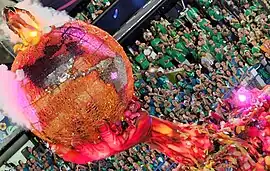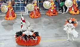 ![]() Ala 18: "Bate-Bolas". A ala representa os grupos de bate-bolas e sua ligação ao culto de Exu. Segundo relatos da tradição oral, os brincantes iniciados em religiões afro-brasileiras, como umbanda e candomblé, devem necessariamente pedir licença a Exu e sair com a máscara levantada, ou seja, não podem cobrir o rosto – daí o porquê da fantasia da ala exibir as máscaras no alto das cabeças. Segundo Felipe Bragança, em matéria de 2014 para o "Le Monde Diplomatique Brasil": "Os mais velhos falam que ao colocar uma roupa de bate-bola você recebe uma entidade, alguma coisa entre egum, Exu, Ogum ou anjo". |