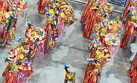 ![]() Ala 3 (Baianas): "Ventou no Canavial". O nome da fantasia faz referência a um ponto dedicado a Exu: "Ventou no canavial / E um trovão lá no céu ecoou / Salve Iansã e Xangô / Salve a coroa de Exu Marabô". As fantasias simbolizam Exu enquanto força que, unida à justiça de Xangô e à intempestividade de Iansã, conduziu milhares de escravizados e quilombolas à luta pela liberdade. Colocar fogo no canavial era um ato de insubmissão e uma estratégia utilizada por escravizados quando das fugas para os quilombos. Nas saias das baianas são utilizadas cores quentes, remetendo ao fogo. Os abanos de vime são borboletas de Iansã, símbolos de transformação. As estamparias foram desenvolvidas pelo designer Toín Gonzaga. A cana-de-açúcar, também simbolizada na fantasia, é um alimento associado a Exu e utilizado em oferendas e rituais específicos. |