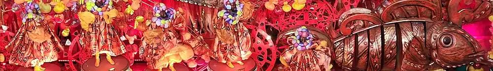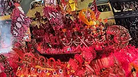 ![]() Parte frontal da alegoria 3: esculturas de Exus e Pombagiras, talhadas por Marina Vergara, com a estética das imagens de entidades vendidas em lojas de artigos de Umbanda, criam um cenário inspirado na instalação "O Cortejo", de Nelson Leirner. A terceira alegoria, "Reinado Catiço" é um altar em devoção ao Povo da Rua e uma celebração dos espaços que cercam este universo (cabarés, botequins, cassinos, etc). A parte frontal do carro é inspirada na instalação "O Cortejo", de Nelson Leirner, e na estética das lojas de artigos de Umbanda. Onze imagens de Exus e Pombagiras, posicionadas sobre platôs e intencionalmente sobrepostas, corporificam um peji, um terreiro ambulante que expõe esculturas talhadas por Marina Vergara. Entre as onze entidades esculturadas estão Maria Padilha, Seu Tranca Rua, Seu Zé Pelintra, Dona Maria Navalha, Pombagira Cigana, Dona Sete Saias, Seu Capa Preta, Pombagira Rainha das Sete Encruzilhadas, Seu Sete da Lira, Exu Malandro das Almas e Pombagira da Figueira. Compondo a cenografia, de maneira análoga ao que é observado nos altares dedicados aos Exus Catiços, notam-se objetos que ajudam a contar a história dessas entidades: anéis, batons, camafeus, moedas, taças, navalhas, frascos de perfumes, rosas, etc. ![]() Visão lateral do terceiro carro: Grupos coreográficos de Exus e Pombagiras nas varandas dos Arcos da Lapa. Abaixo, a Velha-Guarda sentada em mesas de botequim. ![]() Parte de cima da alegoria: elementos ligados ao universo das jogatinas, além de uma grande lua, criam um cenário noturno. Destaques e composições Destaque central alto: Enoque Silva (Fantasia: Luz da Lua, luz das ruas) Destaque central baixo: Ana Beatriz Genuncio (Fantasia: Coração pulsante) Destaque performático alto (Lua): Guilherme Linhares (Fantasia: Rei da Noite) Destaque lateral baixo (esquerda): Priscilla Levinson (Fantasia: Perfume de rosas) Destaque lateral baixo (direita): Luciana Monteiro (Fantasia: Sedução lilás) Destaque lateral médio (esquerda): Pepita (Fantasia: Joia do cabaré) Destaque lateral médio (direita): Cidinha Oliveira (Fantasia: Magia cigana) Destaque traseiro alto (esquerda): Rafael Faria (Fantasia: Exu Marabô) Destaque traseiro alto (direita): Ton Brício (Fantasia: Exu Tiriri) Composições femininas (dados): Fantasia Sorte no jogo Composições botequim: Velha-Guarda (Zé Pelintra e Maria Navalha) Composições teatralizadas (Arcos da Lapa): Fantasia: Povo da Rua |