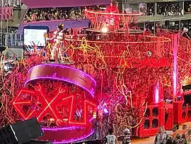 ![]() Comissão de Frente: "Câmbio, Exu". A proposta da comissão é o olhar de Estamira, catadora do lixão de Jardim Gramacho, em Duque de Caxias, que parecia se comunicar com Exu. Os desenhos coreográficos, figurinos e o elemento alegórico representam o universo imaginário de Estamira, onde Exu, com o seu poder transformador, recria um mundo que estava devastado, dando voz aos que historicamente foram silenciados e mostrando a força da resistência afro-diaspórica. Durante a apresentação, bailarinos sobem em cabaças que se movimentam sozinhas, evocando a simbologia da criação do mundo, uma vez que Exu é o "Senhor da Terceira Cabaça" (IgbáKetá). Interpretando Exu, o ator Demerson D'Alvaro sobe no elemento alegórico que representa um globo terrestre segurado por uma mão. Em cima do Globo, ele come o padê oferecido a Exu. |