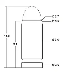 | 2,34mm rimfire[3] | 2,34 (.092) | 6,1 (.240) | 2,8 (.110) | ? | ? | ? | 9,13 (.359) |