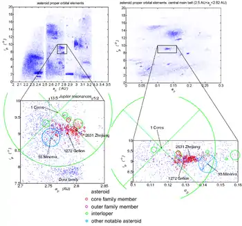 Até recentemente, esta família era conhecida como família Ceres ou familiar de Minerva de 1 Ceres (o maior asteroide) ou 93 Minerva. No entanto, as análises espectroscópicas mostraram que estes maiores membros eram na verdade intrusos em sua própria família,[2] com tipos espectrais diferentes dos da maioria dos membros. Outros intrusos conhecidos são 255 Oppavia, 374 Burgundia, 2507 Bobone, e 2559 Svoboda.[3] Isso deixou o asteroide relativamente menor 1272 Gefion como o membro da família. com o menor número.