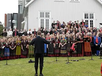 | Políticos, padres e coro em frente do parlamento Løgting | |||