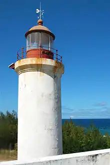 Torre cilindrica em alvenaria, caiada de branco com edifícios adjacentes, com 13,5 metros de altura.[2]