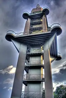 É uma torre mirante quadrangular de concreto, com quatro pernas e uma grande coluna central também quadrangular. Possui duas plataformas de observação, e 47 metros de altura.[2]