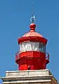 Torre quadrangular de alvenaria, forrada a azulejos brancos e edifícios anexos, lanterna e varandim vermelhos.
