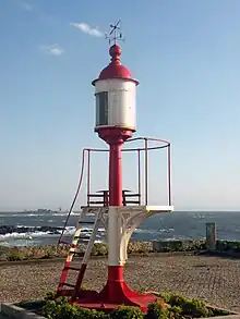 Tratava-se de uma coluna com varandim e lanterna branca em frente a marca rectangular às faixas brancas e vermelhas.